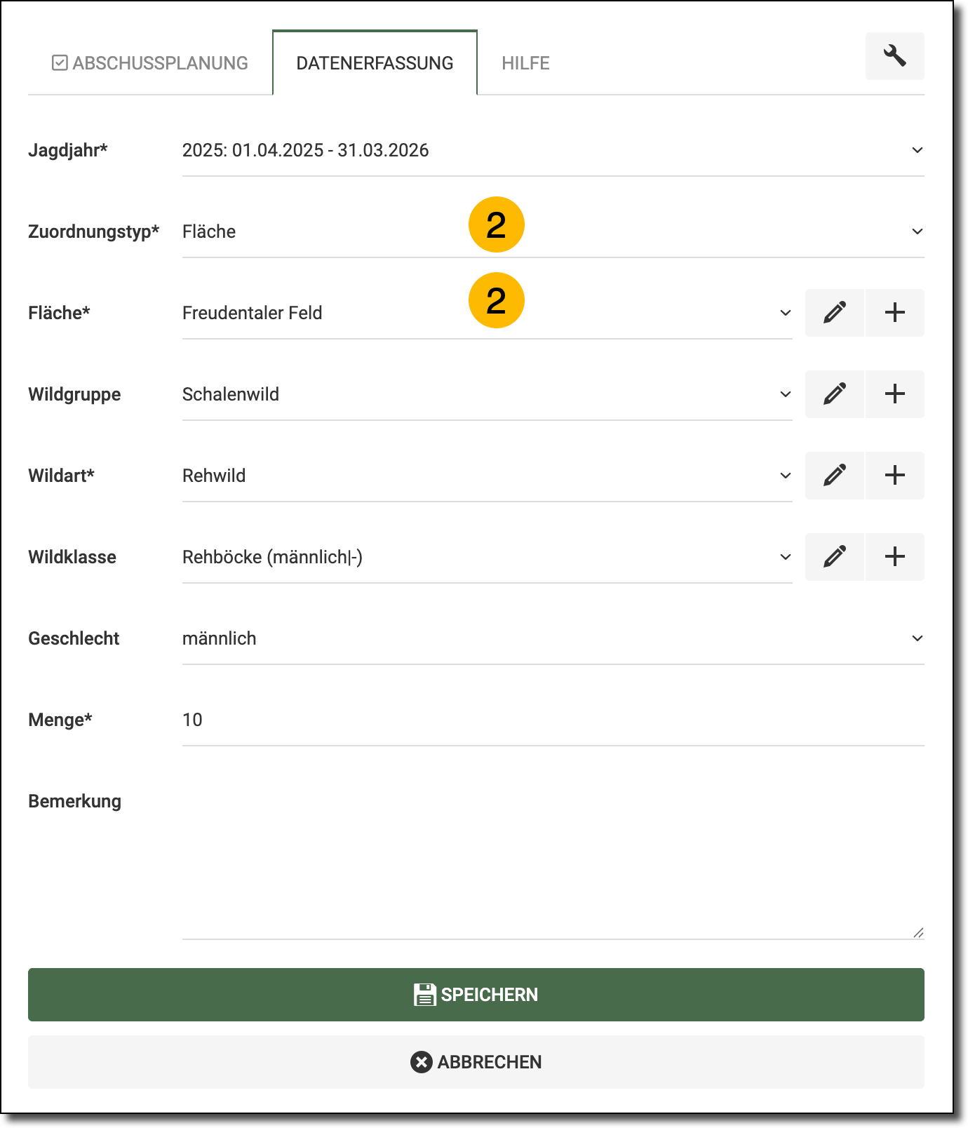- Im Feld Wildart wählen Sie die Wildart, für den die Abschussplanung gelten soll.