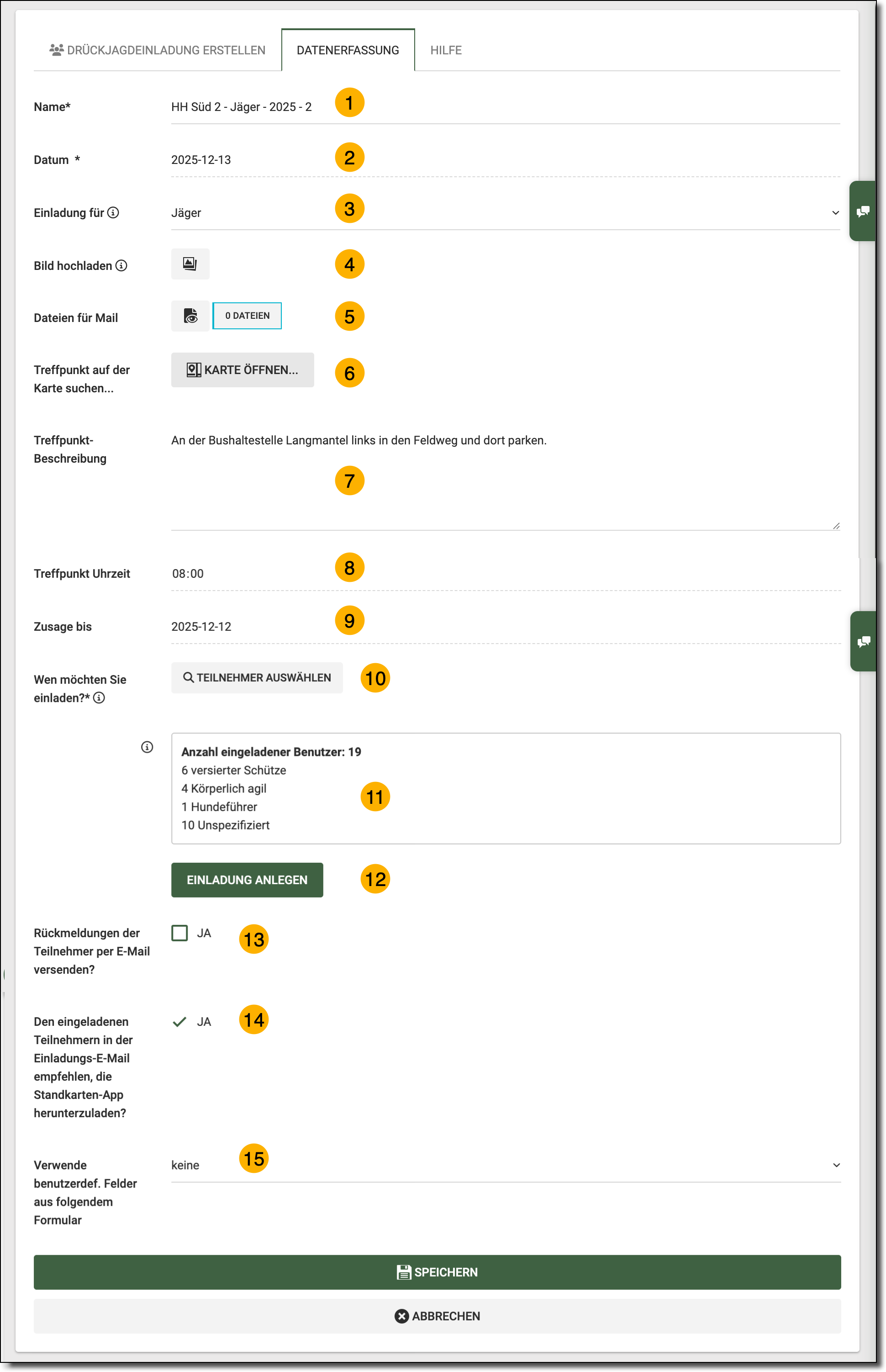 - Im Feld Name geben Sie der Drückjagdeinladung einen Namen.