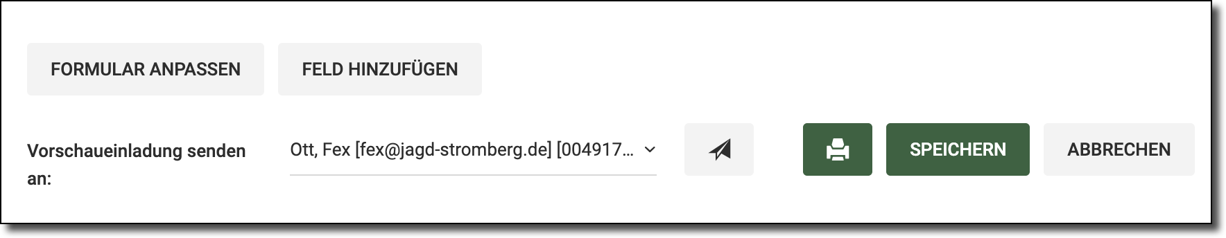 - Im Aufklappmenü Vorschaueinladung senden an wählen Sie einen Empfänger – idealerweise Sie selbst – aus, dem Sie die Drückjagdeinladung testweise per Email senden möchten.