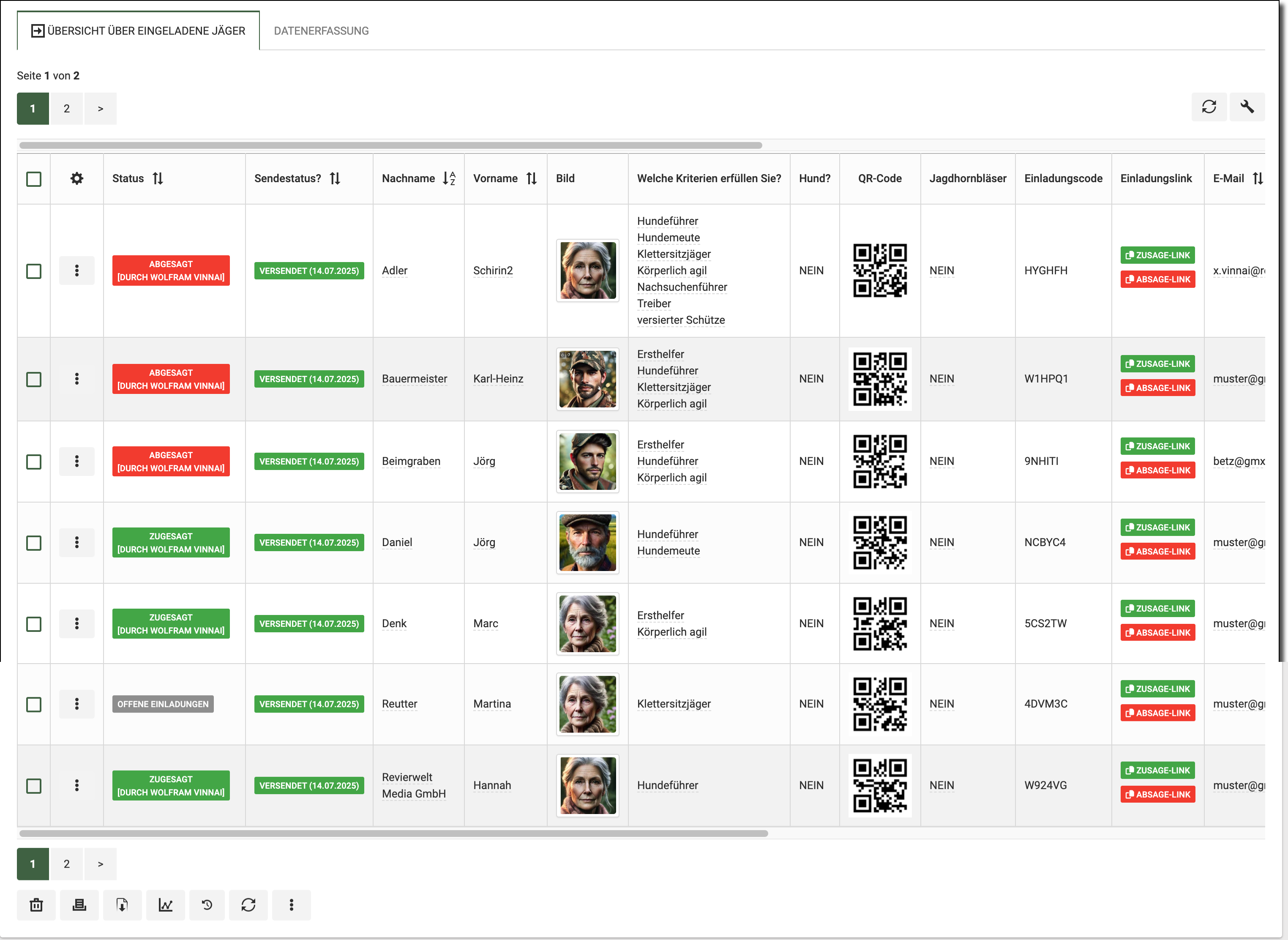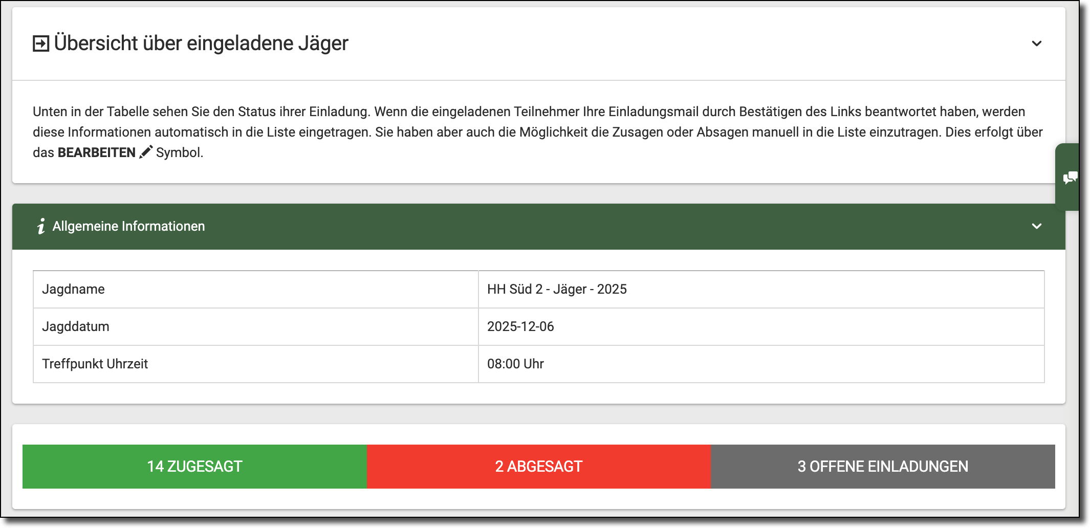 Im folgenden Fenster finden Sie eine Übersicht der eingeladenen Jäger. Sie können hier auch noch Änderungen oder Ergänzungen vornehmen.