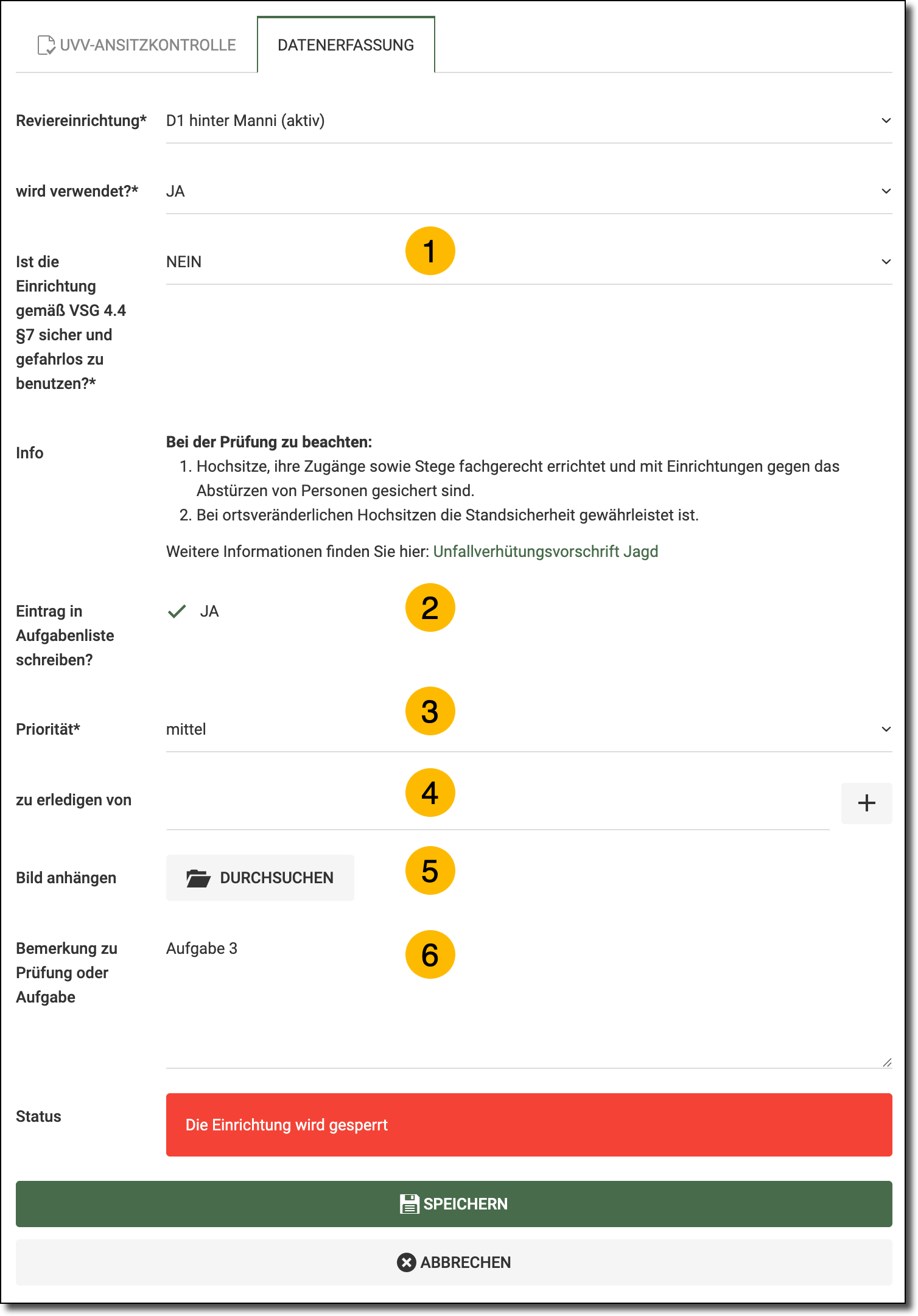 Mit Hilfe dieser Funktion können Sie die vorgeschriebene jährliche UVV-Ansitzkontrolle revisionssicher dokumentieren.