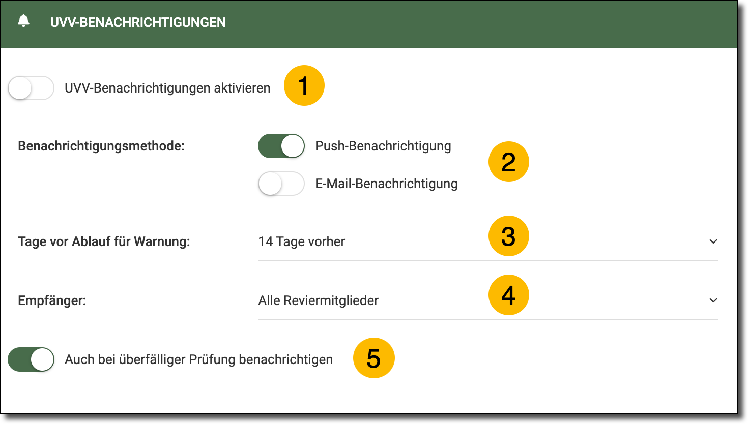 - Hier legen Sie fest, ob Sie Benachrichtigungen über die UVV-Kontrolle erhalten möchten.